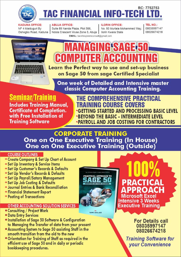 Sage 50 Training is designed to equip you with the skills that need to secure job and improved your organization recording processes. The training will also be a good understanding of the financial process from Purchase and Sales ledger to Final Trial Balance. Sage 50 solutions is a Smart Business Management Solution on Accounting, Inventory, Payroll, and Management Reports. Sage is a leader in Integrated Accounting and Payroll Technologies supporting the ambition of business leaders and game changers around the world. The software can be used in Commercial, Manufacturing, and Non-Profit Organization.